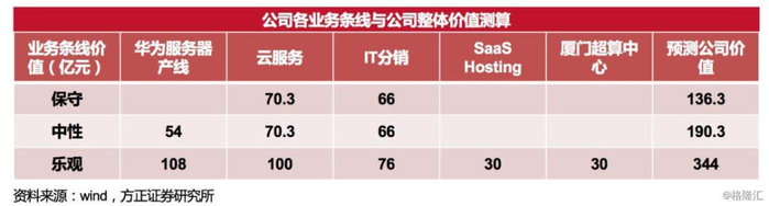 SaaS hosting、超算中心等新业务持续推进。基于公司现有业务能力及布局,公司SaaS Hosting海外云托管、超算中心建设等新业务亦稳步推进,新业务除了给公司带来新的收入来源外,亦能给公司商业模式带来升级。公司当前价值低估。分别从保守、中性、乐观三个维度测算公司合理价值,仅考虑IT分销和云服务两块传统业务,得出公司保守价值为136.3亿元。