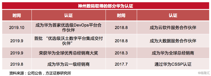 神州数码与华为合作已久。双方在2016 年便签署战略合作协议,共同宣布在行业云等领域展开全方位的战略合作,未来继续加强合作的基础十分深厚。2018 年3 月,神州数码正式启动“大华为”战略,将分散在不同业务板块的华为业务进行整合,成立华为业务群,形成统一的前中后台,实现内部协同。2019年11月率先宣布拟投资基于“鲲鹏”的国产服务器、PC 产线,与华为合作再上一个台阶。