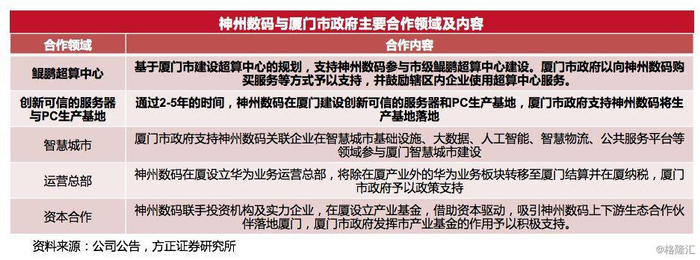 2019年7月,厦门市政府与华为公司签订合作协议,华为首个鲲鹏生态基地及超算中心正式落户厦门,预计总投资规模达15亿元左右。近日,神州数码发布公告,拟与厦门市展开战略合作,在鲲鹏超算中心、创新可信的服务器与 PC 生产基地、智慧城市等多领域展开战略合作。基于厦门市建设超算中心的规划,厦门市政府支持神州数码参与市级鲲鹏超算中心建设,以向神州数码购买服务等方式予以支持,并鼓励辖区内企业使用超算中心服务。