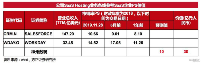 神州数码的SaaS Hosting业务将采取分成方式获得收入,即参与海外SaaS公司在中国市场的营收分成,分成比例约为30%,该业务将根据实际销售年份持续分成,和传统SaaS订阅收费的模式较为类似,因此我们认为采取PS市销率估值较为合理。