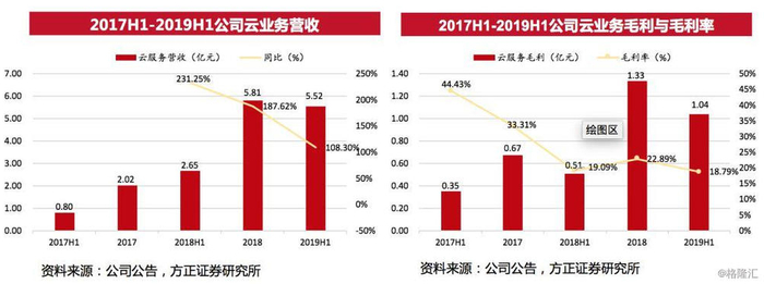2017H1-2019H1,公司云业务保持高速增长趋势,CAGR在100%以上。2019H1云业务为公司带来营收5.52亿元,实现毛利1.04亿元,为公司业绩新的增长带来充沛动力。2019上半年,公司巩固和加强了在专业服务和托管运维服务领域的技术服务优势,升级完善了跨云管理平台;不断提升世界 500 强等头部客户的渗透率,尤其是在零售快消和汽车行业,凭借丰富的服务经验和良好的客户反馈,新签数家全球知名企业。
