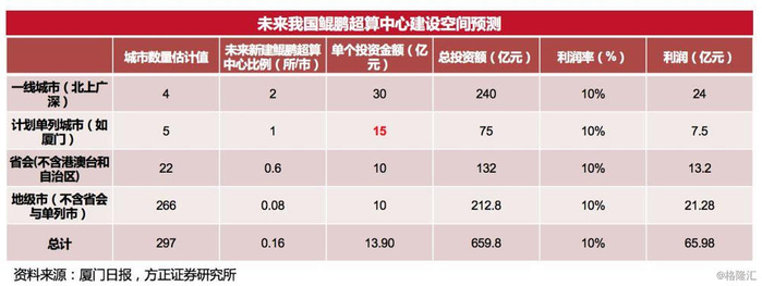 假设未来我国地级市均有国产超算中心的建设需求,我们测算了该业务的市场空间:(如下表)