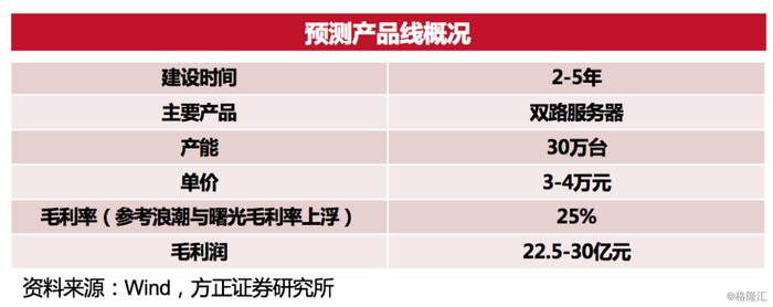 除超算中心之外,合同还披露通过2-5年的时间,神州数码集团将在厦门建设创新可信的服务器和PC生产基地,厦门市政府将支持神州数码生产基地落地。2019年1月,华为发布鲲鹏920服务器处理器。鲲鹏920处理器兼容ARM架构,采用7nm工艺制造,可以支持32/48/64个内核。华为在ARM架构处理器领域深耕多年,产品性能优越,未来基于“鲲鹏”的国产服务器市占率有望不断提升。另一方面,相对于核心芯片等部件均被国外掌控的X86服务器,国产服务器业务毛利率有望大幅提升。我们预测鲲鹏服务器产线投入情况如下图: