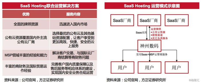 2019年8月,神州数码在其2019全球合作伙伴峰会上发布SaaS Hosting战略。联合运营(SaaS Hosting)业务是为了全球数千家SaaS企业更好的拓展中国市场,服务内地客户而推出的专项服务,主要包括合规性咨询、基础资源购买、应用部署、运维、ICP备案及牌照申请、运营系统搭建、400客户支持服务、商财务服务、客户成功服务等。