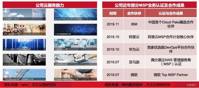 坚定转型云服务,稳居国内第一梯队。公司17年开始全面转型MSP云管理服务业务,目标是希望依托公有云 MSP 业务打通从上游海量云资源聚合到云增值服务的完整云服务价值链,公司云业务近年来连续翻倍高速增长,根据IDC报告,公司云服务业务在国内排名第二,与数梦工厂等明星企业同属第一梯队。