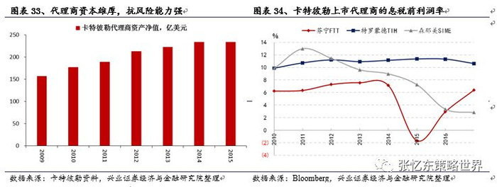 截至2015年底,卡特彼勒拥有177家代理商,卡特彼勒的每一家代理商都是拥有强大综合实力的优质代理商,其总资本净值从1990 年的约40 亿美元,飙升到了2015年的234 亿美元,复合年增长率达到7.3%。