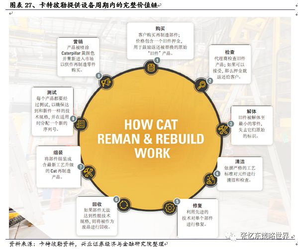 同时,经历了经济总量结构性调整后,卡特彼勒避免采取上游垂直整合的策略,为了缓和经济周期对公司盈利的影响,公司开始重视增值服务转型,为客户提供涵盖了产品、技术和服务的完整产业链条,包括产品设计、机械设备制造、零配件服务、物流服务、供应链、金融服务、再制造服务等的整体解决方案。