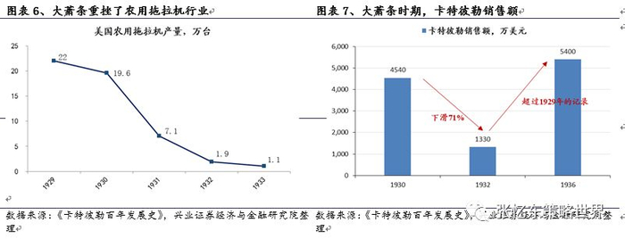 卡特彼勒合并成立四年后,美国经济遭遇大萧条,公司销售额锐减71%,借助向工业化时期的前苏联销售设备和零部件,卡特彼勒幸存。经济萧条期,卡特彼勒依然重视研发新产品,创新地将柴油机替代汽油机应用到履带式拖拉机上,这种新产品生产效率高、操作费用低,是当时萎靡不振经济下用户合适的产品选择。
