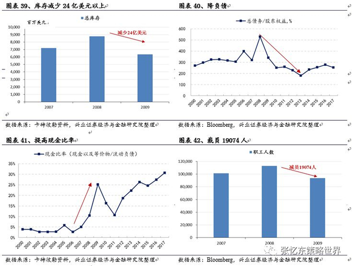——70年代开始,美国经济结构分化,卡特彼勒的抗逆境能力充分体现管理层的决策智慧:(1)重置生产流程:摒弃批量生产,拥抱柔性制造;(2)改革组织架构:由集中控制的成本中心转变为总经理掌舵的利润中心模式;(3)启动六西格玛与精益生产,注重品质提升和成本降低;(4)发展配套增值服务,多环节寻求利润;(5)未雨绸缪,制定“低谷期战略计划”,在不损害复苏前景的前提下迅速调节产量、降低成本。