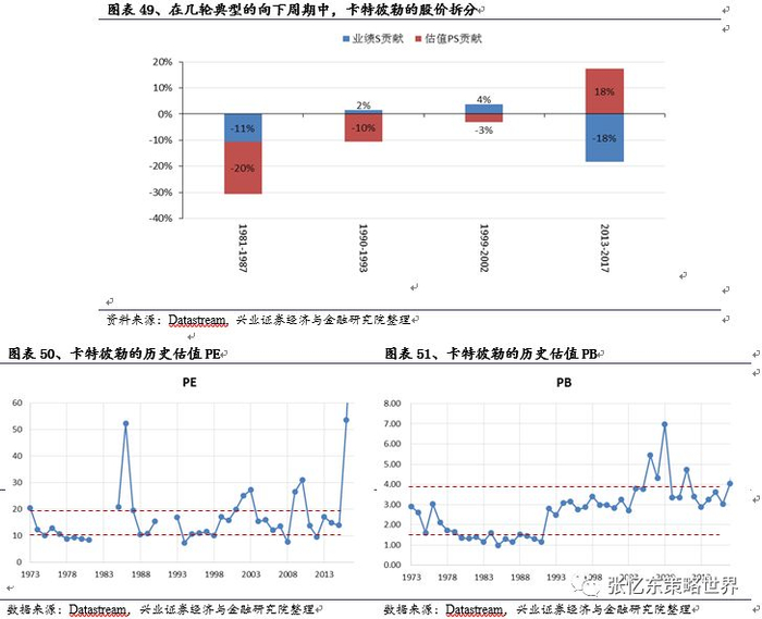 从股价驱动因素来看,80年代经济转型背景下,传统行业面临衰退及强劲竞争对手,此时对估值的杀伤力尤为剧烈。当卡特彼勒全球龙头地位确立后,投资者更理性对待经济敏感型公司的业绩波动,同时给予龙头公司估值溢价。