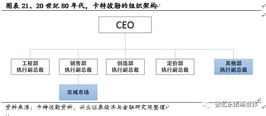 在20世纪80年代,卡特彼勒采用层级制、职能化的公司架构,最接近市场的销售经理可能需要得到多达六、七位上级管理人员的层层批准才能得到是否允许给予客户折扣的批复。因此,管理中心高度集权、等级森严,却远离市场、反应迟钝。同时,工厂经理很难判断某款新推出的产品是否能够盈利,因为公司缺乏内部转移定价机制,大部分管理人员只能依据零散的信息进行业务决策。因此,某些优秀人才的企业家精神被扼杀,部门资源难以得到合理利用。种种弊端不一而足。