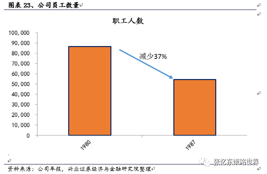业务部门制改革后,公司对投资收益率的关注放在首要位置,为项目投资设定了最低17%的税前资本回报门槛。5家制造工厂被关闭,无利可图的产品也被停产,公司员工数量从1980年的86350名锐减到1987年的54463名。