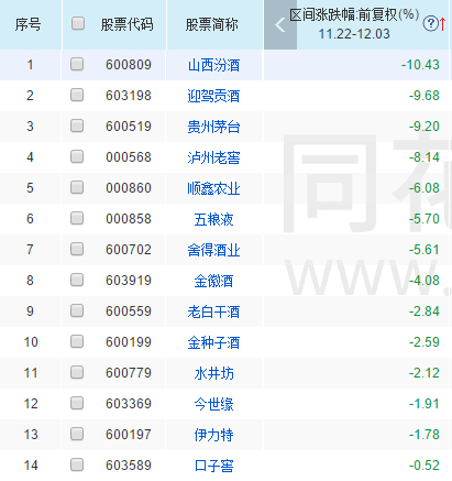 贵州茅台连续调整8天,驱动君整理了近8个交易日(茅台开始调整以来),白酒股中累计下跌的票,如下表: