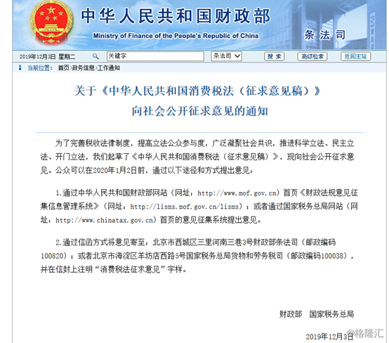 12月3日盘后,财政部发布关于《中华人民共和国消费税法(征求意见稿)》向社会公开征求意见的通知。《征求意见稿》基本延续了《条例》的规定,将销售货物、加工修理修配服务、有形动产租赁服务、以及进口货物等适用税率调整为13%;将销售交通运输、邮政、基础电信、建筑、不动产租赁服务、不动产,转让土地使用权,销售或者进口农产品等货物的适用税率调整为9%;销售服务、无形资产、金融商品的适用税率为6%,保持不变,同时,明确增值税征收率为3%。