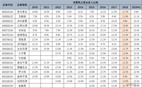 数据显示,2018年大部分白酒企业消费税额占其营业收入比例,基本上已经达到12%,由此可见,后续若要对白酒加征税率,空间也不大。