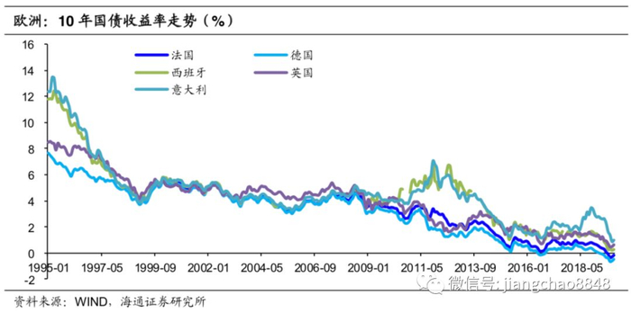 在政府负债率上升的同时,欧洲各国的利率水平也处于长期下降的趋势,二者同样呈现反向关系。而欧洲也是受负利率影响最严重的区域,欧央行目前的存款便利利率已经降至-0.5%,欧元区10年期公债利率也达到-0.3%左右。欧洲主要国家,如英国、法国、德国、意大利等10年国债利率均在0附近。