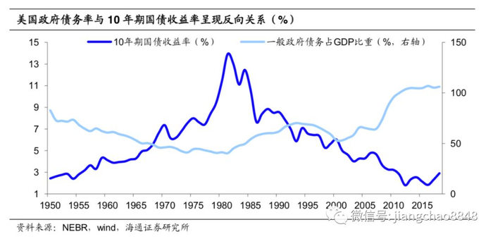 观察50年代至今的数据,美国政府债务率与国债收益率呈现反向关系。我们认为主要原因有以下几点: