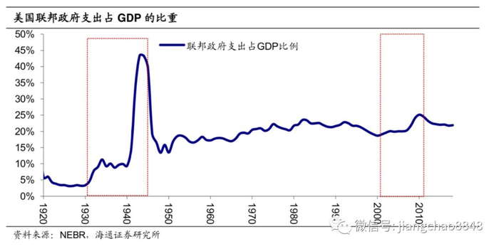 美国“大政府”的形成路径经历了较为漫长的时期。回顾过去的100年的数据,我们观察到美国的政府规模(联邦政府支出占GDP的比重)自30年代开始不断扩大,从20世纪20年代的4%增至2018年的22%,大政府趋势愈加明显。美国政府支出占比上升最快的共有两个时期:20世纪30~40年代和21世纪初。