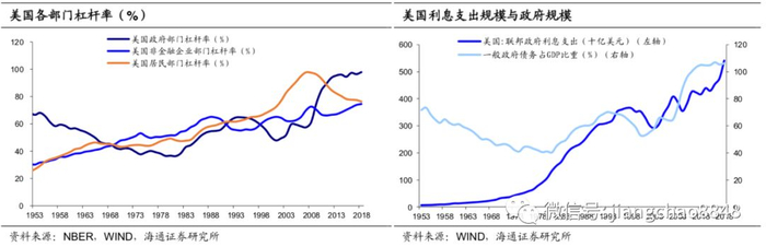 政府债务率与利率呈现反向关系。观察50年代至今的数据,美国政府债务率与国债收益率呈现反向关系。我们认为主要原因有以下几点:1)政府债务规模的快速上升伴随着经济衰退,需要政府加杠杆对冲经济下滑。2)经济衰退背景下货币政策较为宽松。3)政府利息支出增加,低利率可以降低付息压力。