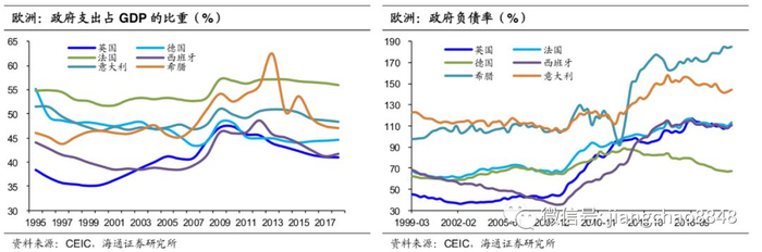次贷危机后的政府债务扩张。欧洲08年以来接连经历次贷危机和欧债危机的冲击,经济增速出现大幅下滑。在政府支出比例没有明显提升的背景下,经济的衰退导致财政收入下降,赤字率上升,政府负债率也被动增加。此外欧洲作为高福利国家,政府面临刚性的福利支出压力,也间接导致负债率上升。