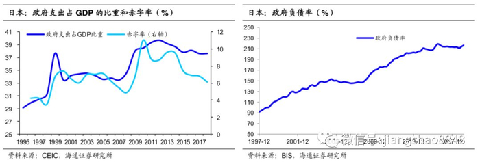 日本的“大政府”倾向从90年代以来愈加明显:一方面是日本政府的支出占GDP的比重从90年代开始逐年攀升,目前已经在38%左右,相比90年代中期上升了8个百分点。赤字率则基本保持在6%以上,最高超过9%。另一方面,日本政府的杠杆率(负债与GDP的比例)也是自90年代以来逐渐上升,目前达到217%左右,傲视全球。