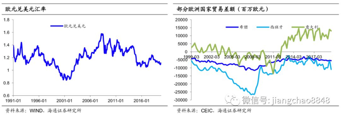 除此之外,深处欧元区的国家不仅没有货币政策的自主性,也同样失去了汇率政策的自主性。日本使用低利率政策的同时,也在主动压低日元汇率,意图拉动外需,缓解经济压力。而欧元区国家受到欧元汇率的牵制,无法通过主动的货币贬值来拉动出口,导致经济的进一步下滑,呈现出内外需双弱的局面。