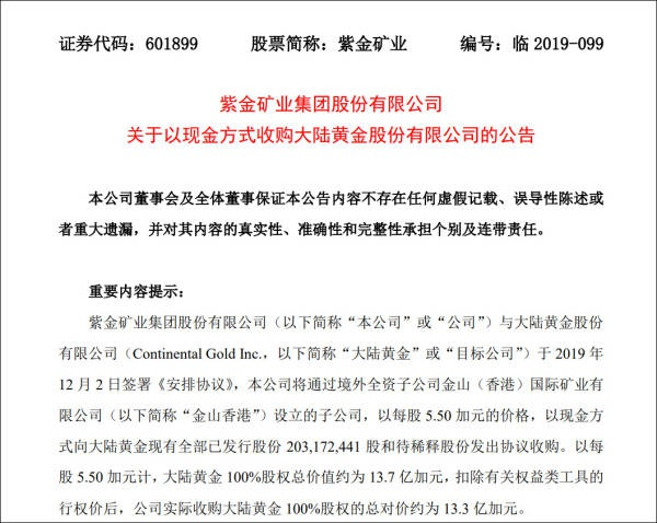 12月2日,紫金矿业发布公告称,将通过境外全资子公司金山(香港)国际矿业有限公司设立的子公司,以每股5.50加元(约合人民币29.62元,4.14美元),以现金方式向大陆黄金已发行的2.03亿股和待稀释股份发出协议收购。本次交易将收购大陆黄金100%的股权,交易金额约为13.3亿加元(约合人民币70.3亿元,10亿美元)。