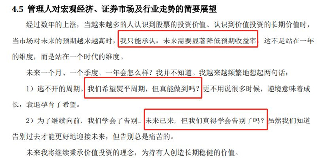 让人遗憾的是,徐彦2018年暂时离开了公募基金。这种遗憾也让你同时看到徐彦有别于市场的清醒。徐彦从2018年初开始,就一直在提醒风险,提醒“降低预期收益率”、“学会告别”。这是2018年3月份他在年度报告中写下的: