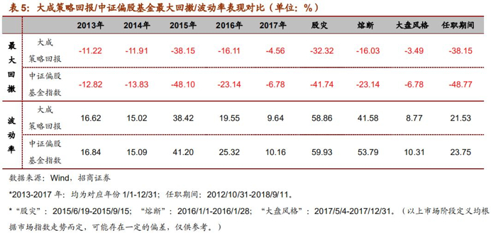 在各自然年度(2013-2017年)及不同的市场阶段(股灾、熔断、大盘风格市场),徐彦所管理的大成策略回报的回撤、波动率均相对中证偏股型基金指数更小,在不同市场风格下均能稳控风险。同时,风险调整收益指标(Sharpe)在不同年份(2013-2017年)同样表现更佳。