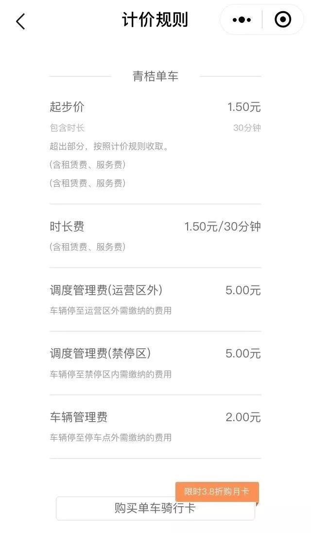 12月2日,据北京晚报报道,青桔单车近期调整了计费规则,起步价由此前的1元调整为1.5元,包含时长30分钟,超出30分后每半小时收取1.5元,鼓励用户购买骑行卡。在北京,如骑行一小时,青桔的骑行花费为3元每小时。
