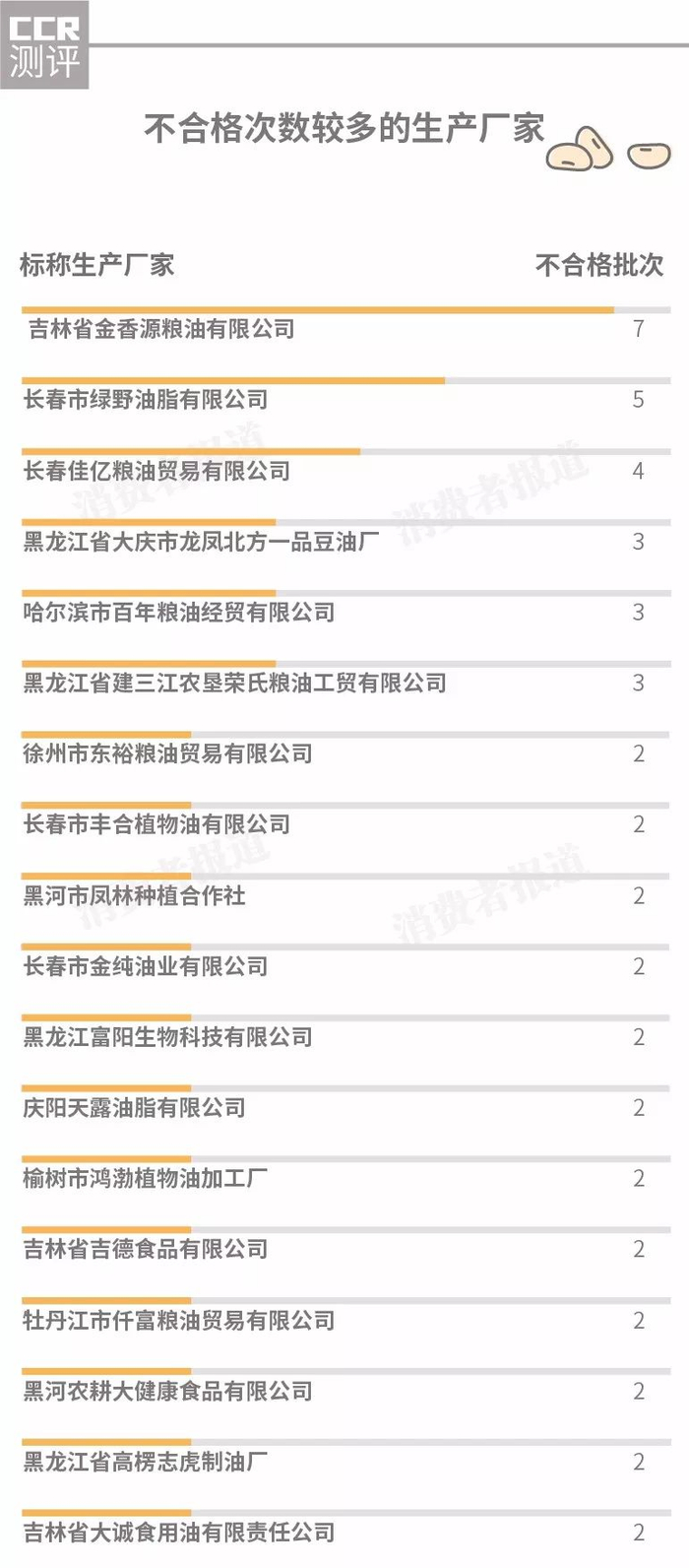 抽检结果显示,标称由吉林省金香源粮油有限公司生产的大豆油不合格次数居首,高达7次,不合格的原因均为溶剂残留量超标(规定为不得检出),且涉嫌用浸出油冒充压榨油。