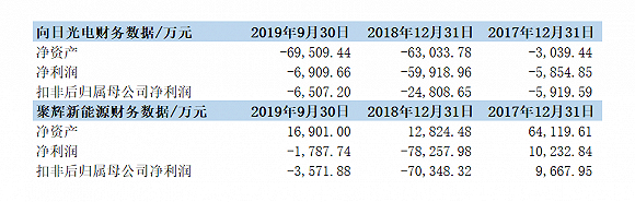 据公告披露,向日光电2017-2019年9月一直处于亏损状态,特别是2018年,亏损达5.99亿元。不仅如此,向日光电从2017年至今其净资产一直为负。此外,向日光电及其下属公司涉及诉讼、仲裁等法律纠纷,涉及金额达100万元人民币及以上。