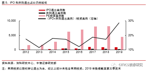 IPO和并购退出是PE投资项目两个比较好的退出渠道,但从图5来看,二者合计占比还不到30%(这里以当年退出案例数除以当年投资案例数不尽合理,但反映的趋势是相同的),意味着大量项目无法以较好渠道退出或者缺乏渠道退出。GP的退出能力对于PE基金最终收益影响很大。