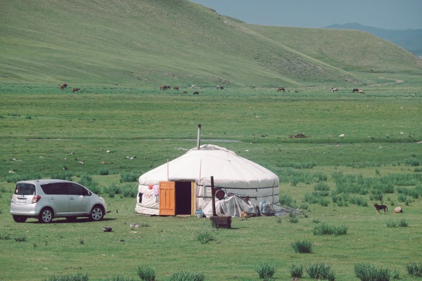 此时,牧民的蒙古包多了起来。牛和马被拴在桩上,丰田汽车停在围栏旁,顽皮的孩子在河边嬉闹。