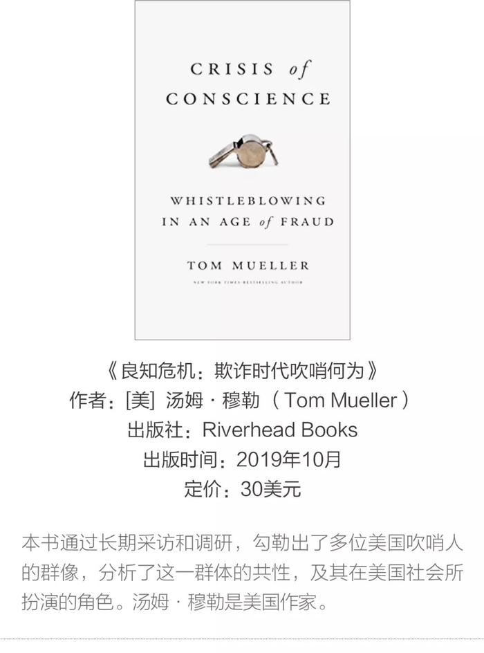 除了上述4位举世闻名的吹哨人,在美国还有很多为了公共利益而“吹哨”的故事。穆勒(Tom Mueller)的《良知危机:欺诈时代吹哨何为》(Crisis of Conscience: Whistleblowing in an Age of Fraud)一书,通过持续7年的长期采访和调研,勾勒出了多位美国吹哨人的群像,分析了这一群体的共性,及其在美国社会所扮演的角色。