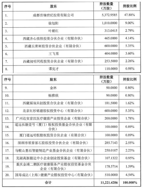 据天眼查显示,今年普瑞眼科在4月和11月分别进行了Pre-IPO轮和战略融资,其中4月份由基石资本、金浦投资、道远资本、普思资本和朗玛峰创投联合投资4亿人民币;12月又获得中国人寿近2亿元人民币的战略投资,根据第五期辅导进展报告显示中国人寿以国寿大健康基金名义持有4.54%的股份,目前公司的股东情况如下: