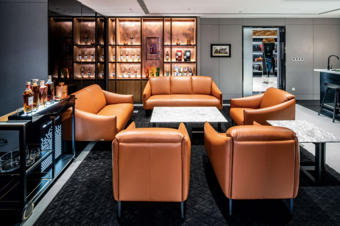 酒业家记者发现该体验中心整体色调以低调奢华的黑色及棕色为主,致敬麦卡伦深沉的品牌格调及天然纯粹的酒液色泽。以品牌V形标志为设计灵感的定制三角形格纹地毯、如琥珀色酒液般的定制沙发及考究的大理石材质,无不体现麦卡伦威士忌的品牌精髓。