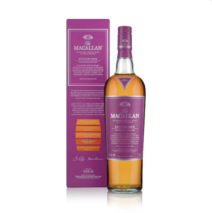 Edition No.5的特别之处是体现在包装上的一种大胆紫色,这是潘通色彩研究机构以麦卡伦威士忌的天然色泽谱、并结合复杂精细的威士忌酿制工艺为灵感,为Edition No.5创作的独特的色彩。