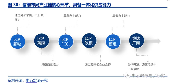 发力布局LCP核心环节,聚焦基础材料研究。如前文所述,LCP天线模组的壁垒集中于上游树脂材料、薄膜、FCCL以及软板。这些环节也是价值链的核心所在。最终的LCP模组仅仅是后端加工制造,并非产业链的关键,技术难度与利润空间非常有限。公司的定位为产品型企业,并非单纯加工制造企业,因此从材料到工艺到产品的全流程均是布局重心。公司聚焦于射频基础材料、有机高分子材料等方向的基础研究,目前在LCP薄膜、FCCL、以及LCP模组环节均取得重大进展,具备生产能力。在原材料端,公司通过向日本厂商进行采购,在软板环节通过委外合作方式。公司具备LCP模组一体化的供应能力,相较单一产业链环节竞争对手具有明显的优势。