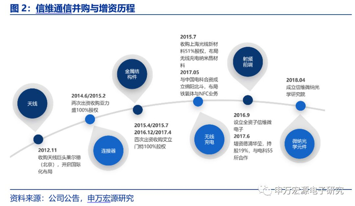 战略性并购是公司实现泛射频一体化布局的重要方式。公司上市之后,首次于2012年收购了莱尔德北京,夯实了自身天线主业,此后便陆续开启了战略收购与增资之路,从天线单一产品逐渐拓向泛射频多品类发展。2014-2015年通过收购亚力盛拓展连接器业务。2015年通过收购上海光线新材料、与中国电科合资成立绵阳北斗,前瞻性地布局磁性材料,发力无线充电业务。2015-2017年合计四次出资,实现对艾利门特的完全收购,布局金属结构件MIM业务。2017年通过增资入股德清华莹切入射频前端领域,为5G时代进行战略储备。