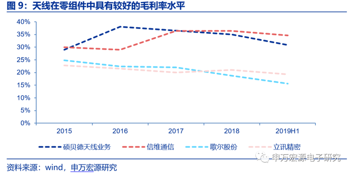 天线定制化属性决定了其具有较高的技术壁垒,设计过程贯穿整机开发全流程,享有较好的毛利水平。天线虽然属于消费电子零部件,但其定制化属性更高,其从终端整机设计开始,需要按照移动终端的外观、功能实现等进行定制化研发,在有限空间实现要求的性能,研发设计贯穿整机开发的全工程,是手机系统架构设计的重要一环。并且整机的任何改动及零部件更换,都需要对天线进行相应的调试和测试,设计及测试壁垒高,并非单纯强调精密制造能力。从毛利率来看,天线供应商毛利率均处于30%以上,且信维近2年毛利率水平在35%左右,显著高于其他的零组件厂商(声学组件:歌尔股份;精密制造、连接器:立讯精密),印证了天线产品具有较好的盈利属性。