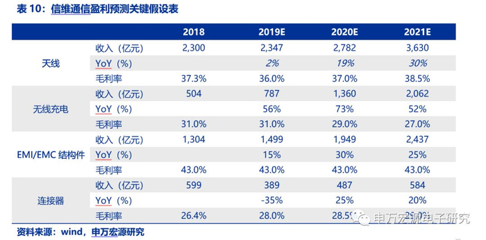 2)无线充电业务:各终端品牌密集推出无线充电机型,已成旗舰机标配,未来将逐步向中端机渗透。公司为全球前三终端客户无线充电供应商,且顺利切入A客户19年新机供应链,预计未来份额与出货量有望进一步提升。预计19/20/21年收入增速为56%,73%,52%。
