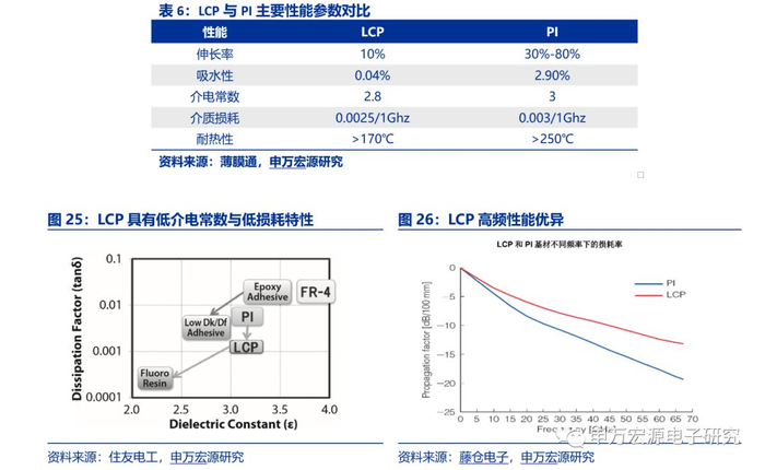 LCP软板应运而生。LCP(液晶高分子聚合物)是一种新型的热塑性有机材料,可以保证较高可靠性的前提下实现高频高速。其特性在于1)在高频范围可保持恒定的低介电常数(Dk=2.9);2)高频损耗小(Df=0.001-0.002);3)热膨胀特性小;4)低吸潮性(吸潮率为0.01%-0.02%,一般PI基材的1/10);5)高弯折性。这些特性均对于高频传输性能有明显改善,因此在终端高频趋势下,LCP软板有望实现对PI软板的替代。