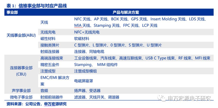 公司于17年进行了事业部改制,现设有ABU部门、CBU部门、微电子部门和声学部门。ABU主要包括天线和无线充电业务,CBU主要包括EMI/EMC等电磁屏蔽件、连接器、金属结构件等。声学部主要包括受话器、扬声器以及一体化声学模组。微电子事业部包括滤波器、功率放大器、射频开关等。目前营收主要由ABU和CBU贡献,其中天线与无线充电占比约60%。声学与微电子事业部系长期战略性布局,2018年已有亿级收入。