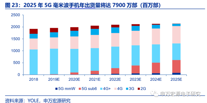 5G最终将走向毫米波阶段,高频高速传输是必然趋势。5G的推进进程主要分为2个阶段。第一阶段是将通信频率提升到6GHz,第二阶段目标是将频率进一步提升到30-60GHz的毫米波级。根据YOLE预测,到2025年5G毫米波手机的年出货量将达到7900万部。随着通信频率的全面高频化,终端对于高频高速传输的需求日益增强。