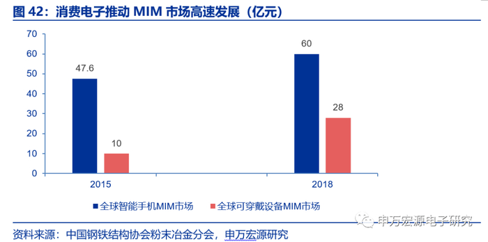 消费电子为MIM重要下游应用,推动市场不断发展。智能手机、可穿戴设备等消费电子产品的轻薄化发展趋势正在加速形成,此类产品核心零部件也更加趋于精密化、复杂化。在此背景下,MIM工艺的应用前景日益明朗,目前该工艺已经广泛应用于卡托、摄像头圈、按键、连接器接口、内置结构件、表壳、表扣等消费电子产品外观结构件的制造。全球智能手机MIM市场由2015年的47.6亿元增长至2018年的60亿元,可穿戴MIM市场由2015年的10亿元增长至2018年的28亿元。