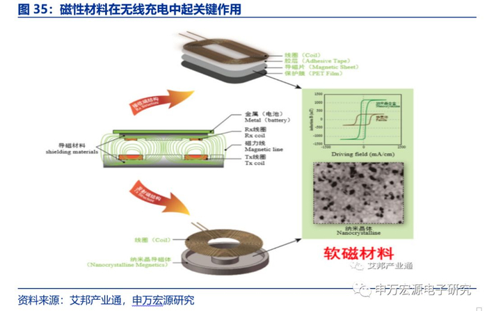 磁性材料是决定无线充电性能的关键。无线充电的结构类似于变压器,由发射端和接收端构成,发射端和接收端都是由线圈和磁性材料构成,磁性材料有不同的选择,有铁氧体、非晶、纳米晶等。软磁屏蔽材料在无线充电中的作用主要为1)隔磁屏蔽:为磁通量提供一条低阻抗通路,降低向外散发的磁力线,减少对周围金属物体的影响,防止产生涡流和信号干扰。2)导磁降阻:提高耦合系数,提升磁电转换效率,使用更少的匝数来实现更高电感的线圈,降低线圈电阻,减少发热带来的效率降低(匝数越多,电阻越高)。