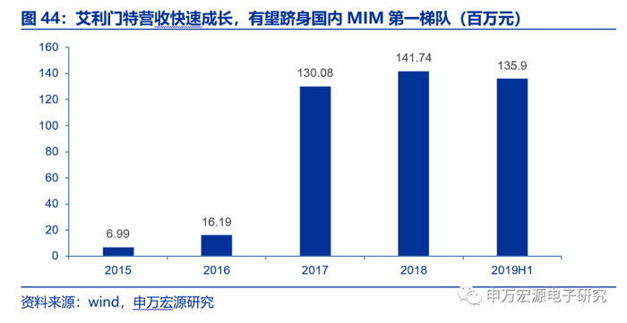 子公司艾利门特专注于MIM工艺,长期协同效应显著。信维通信于2015年入股艾利门特,于2017年实现100%收购。艾利门特专注于金属和陶瓷粉末注射成形技术(MIM)精密五金的研发与生产。其主要产品为消费电子精密结构件。我们认为,艾利门特的MIM技术与公司现有优质大客户资源的整合将产生持续的协同效应。公司通过获得MIM技术,与现有精密冲压、注塑成型等工艺相结合,进一步提升了在精密结构件领域的竞争力。