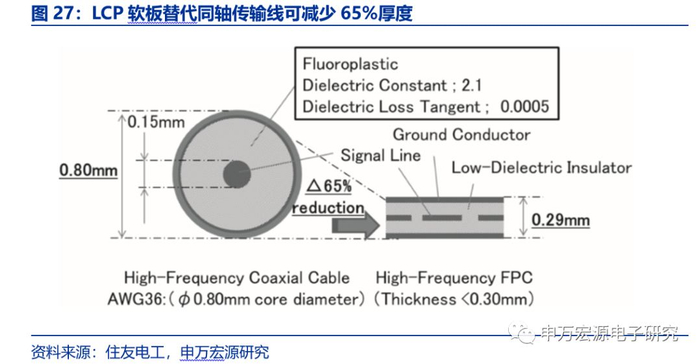LCP软板可替代同轴传输线,减少65%厚度。在常规手机设计中,从天线接收的电磁信号通过同轴电缆传输到主板。 凭借LCP的优异高频传输特性,可实现将天线与线缆传输功能同时集成到多层LCP软板中,从而实现对同轴电缆的替代。同轴电缆中心为铜线,起传输信号的作用,该铜线被绝缘塑料和用作接地导体的外层包围。集成天线与传输线的LCP可以具有类似的结构。外层是GND导体,传输电路位于中心,厚度上可以减少约65%,大幅节省手机内部空间。