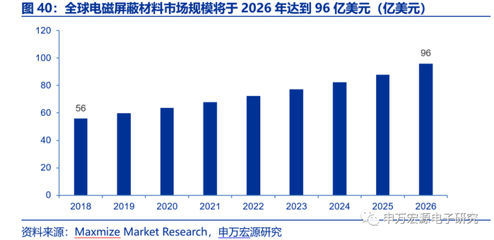 预计2026年EMI电磁屏蔽材料市场规模将达96亿美元。根据机构Maxmize Market research预测数据,全球EMI屏蔽材料市场规模将有2018年的56亿美元增长至2026年的96亿美元,CAGR达到6.66%。其中,消费电子领域中的占比约为35%,则对应2026年逾30亿美元市场规模。